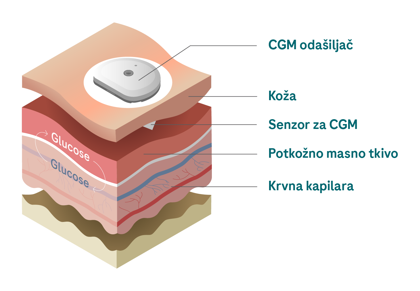 CGM senzor mjeri razinu glukoze u Vašem tijelu, ali ne i u Vašoj krvi u kojoj se ona ipak mjeri ubodom u prst. Umjesto toga, senzorski element CGM aparata nalazi se u sloju kože, u potkožnom masnom tkivu. Ovdje CGM senzor mjeri glukozu u međustaničnoj tekućini koja ispunjava prostor između stanica.